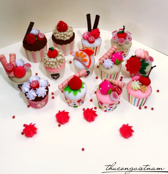 Cupcake làm từ vải nỉ, kích thước 5cm. Được trang trí bởi bánh quế, trái dâu, múi cam, kem bông, kẹo xoắn, cherry,...