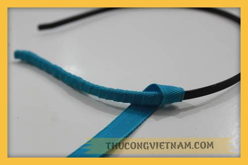 Bôi dần dần keo lên băng đô, sau đó quấn dần dây ruy băng lên
