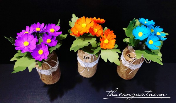 Lọ hoa thủy tinh quấn dây thừng, bọc vải bố, trang trí tag, dây cột nơ cắm hoa cúc màu .