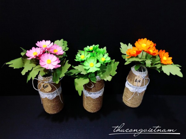 Lọ hoa thủy tinh quấn dây thừng, bọc vải bố, trang trí tag, dây cột nơ cắm hoa cúc màu .