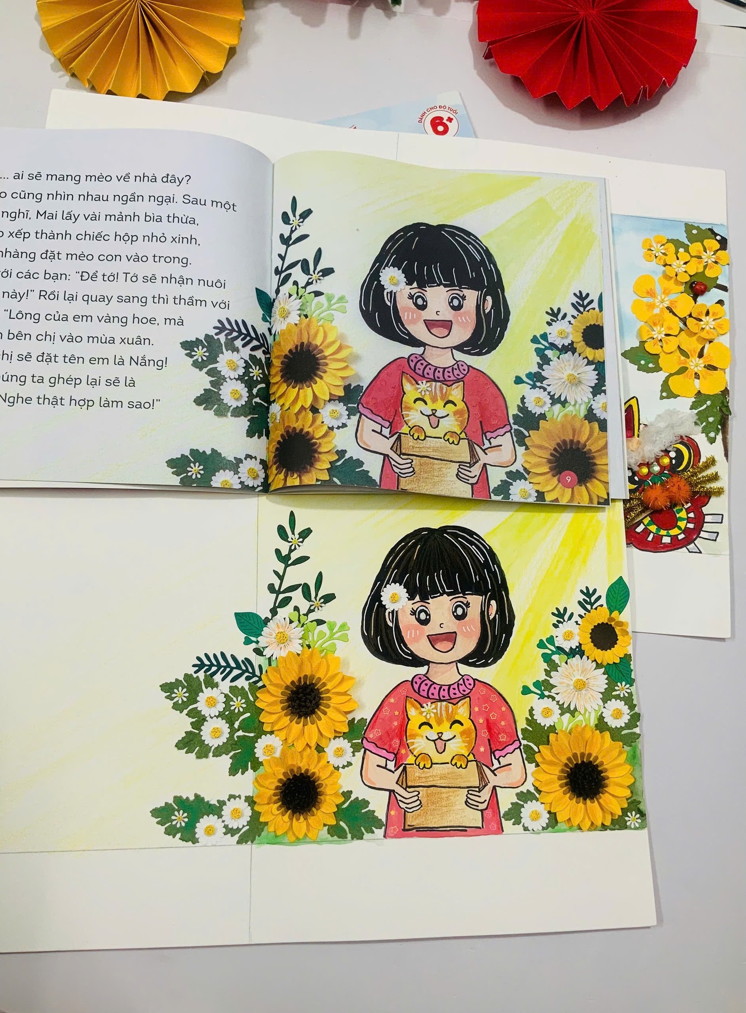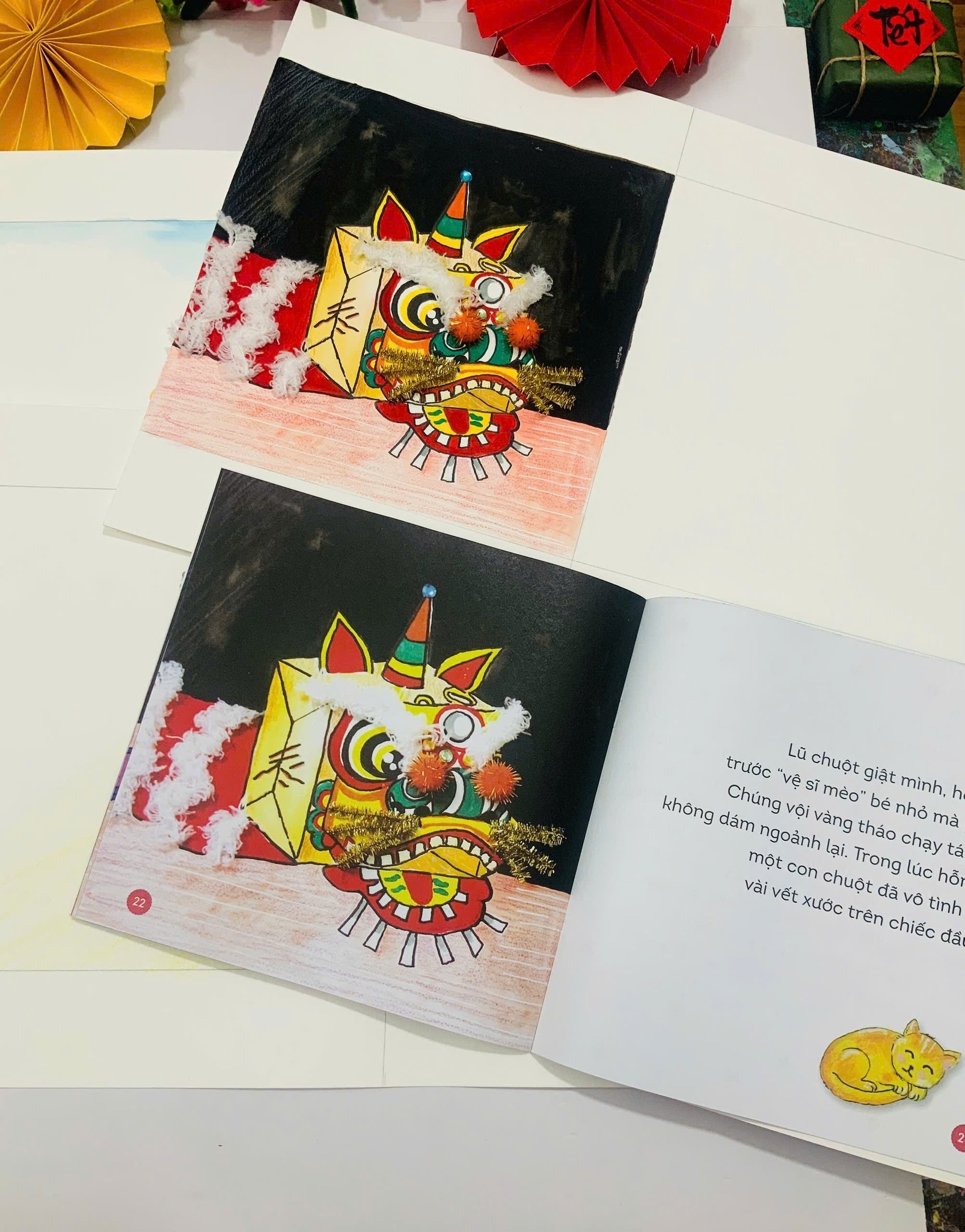 Từng trang sách được tạo nên bằng tay: giấy, len, những lớp cắt dán thủ công, những chi tiết nhỏ mang dấu vết của người làm ra nó. Không phải để phô diễn kỹ thuật, mà để giữ lại cảm giác “thật” – cảm giác mà những cuốn sách được làm vội thường bỏ quên.