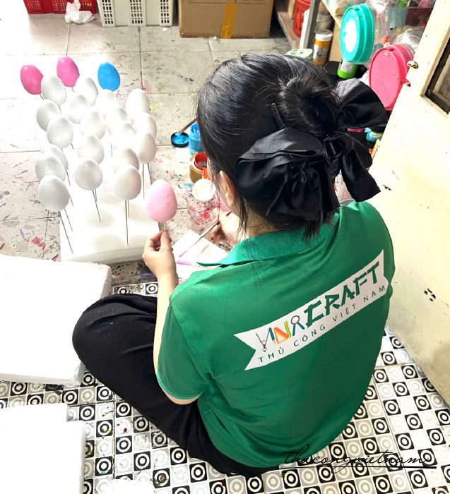 Khác với những sản phẩm công nghiệp, trứng phục sinh tại Vinacraft được tạo hình hoàn toàn bằng tay từ vẽ đến trang trí. Từng nét cọ, từng chi tiết nhỏ đều được đội ngũ nhân sự chăm chút tỉ mỉ, để mỗi quả trứng không chỉ đẹp mà còn mang một cảm xúc riêng biệt.