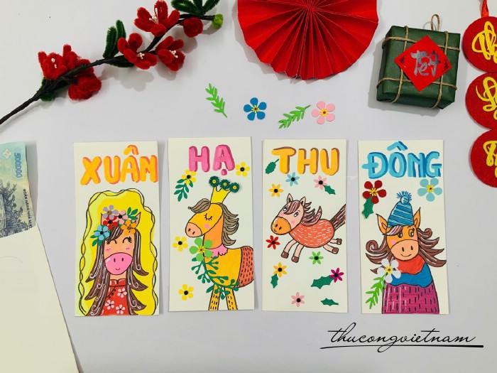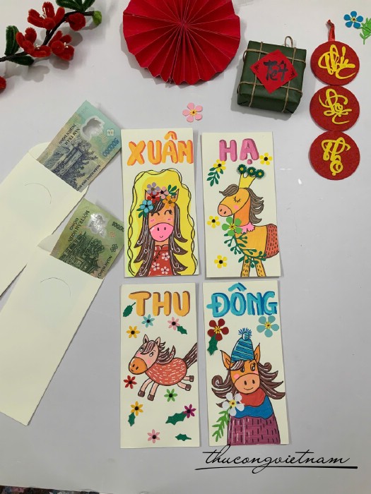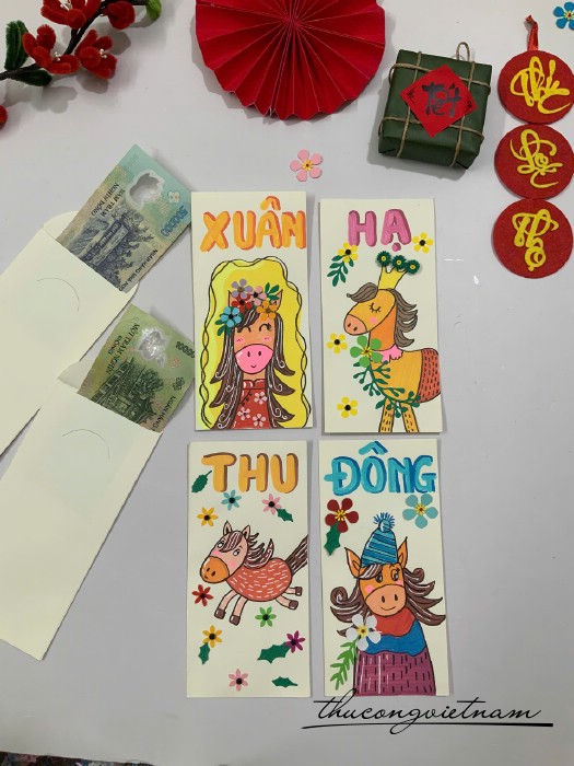 Set 4 bao lì xì vẽ tay, hoa thủ công - Ngựa Xuân Hạ Thu Đông