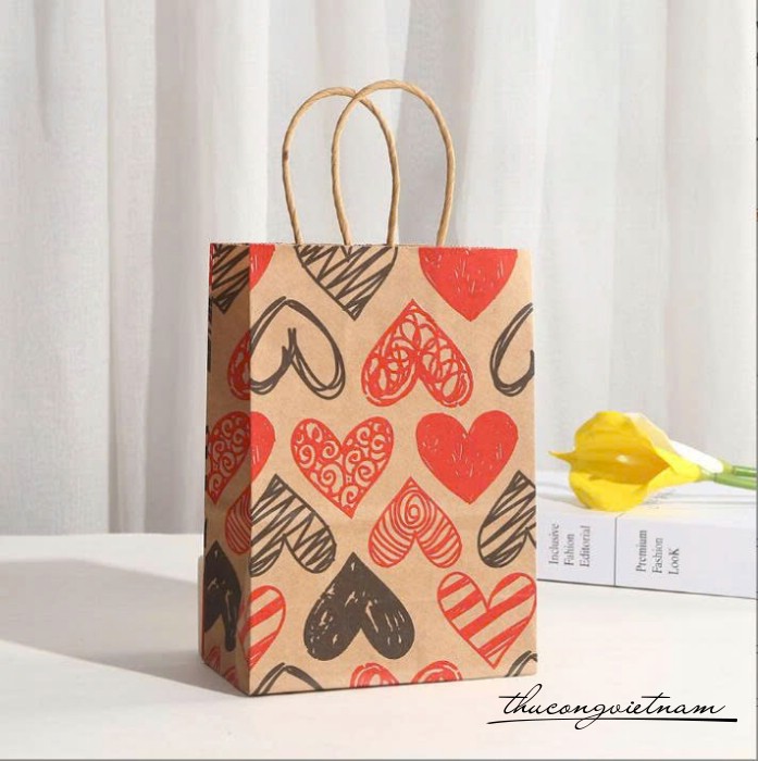 Túi giấy kraft họa tiết trái tim 15*8*21cm (nhiều mẫu)
